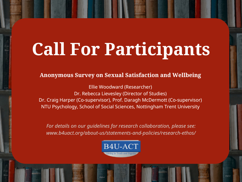 Update, 9/9/2025: Recruitment for this study will be closing soon. If you have not yet already, please consider participating! Original Post, 6/16/2025: B4U-ACT is supporting a new study from researchers at Nottingham Trent University in the United Kingdom. The research project aims to investigate perceptions of sexual satisfaction in individuals…...