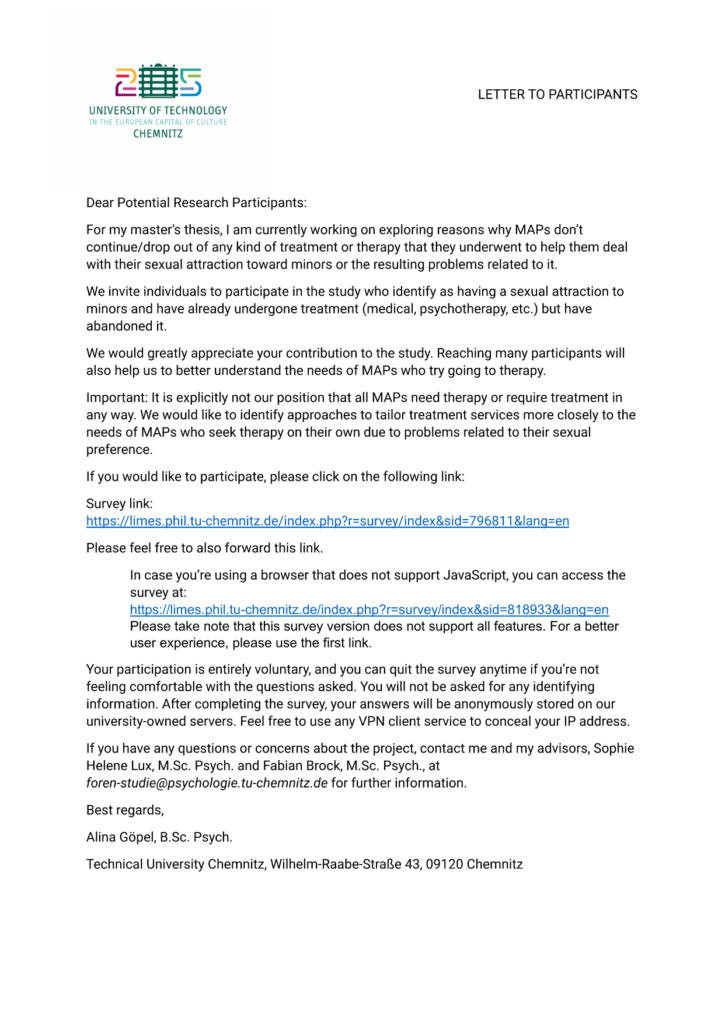 B4U-ACT is supporting a new study led by Alina Göpel, a masters student at Technical University Chemnitz in Germany. The study aims to better understand the reasons why minor-attracted people may drop out of therapy. People who meet the following criteria are invited to participate: