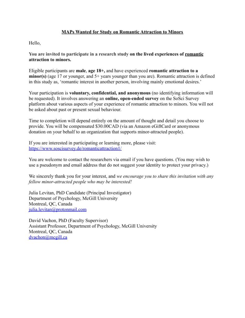 B4U-ACT is supporting a new study from McGill University in Montreal, Canada about the lived experience of romantic attraction to minors. Minor-attracted persons who are male, age 18 or older, and have experienced romantic attraction to minors are invited to participate.